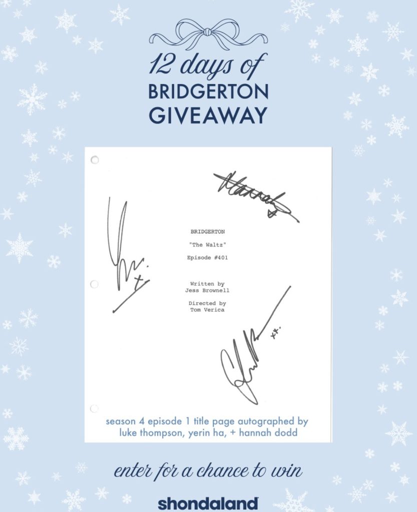 A 12 Days of Bridgerton esemény tizenkettedik napjának keretein belül egy nyereményjátékot hirdettek, ahol az első epizód forgatókönyvének első oldalát nyerhetjük meg Luke Thompson (Benedict Bridgerton), Hannah Dodd (Francesca Bridgerton) és Yerin Ha (Sophie Baek) aláírásával, továbbá elindult a Bridgerton 4. évadának hírlevele, ahol minden hétfőn újdonságok jelennek meg az új évadhoz: